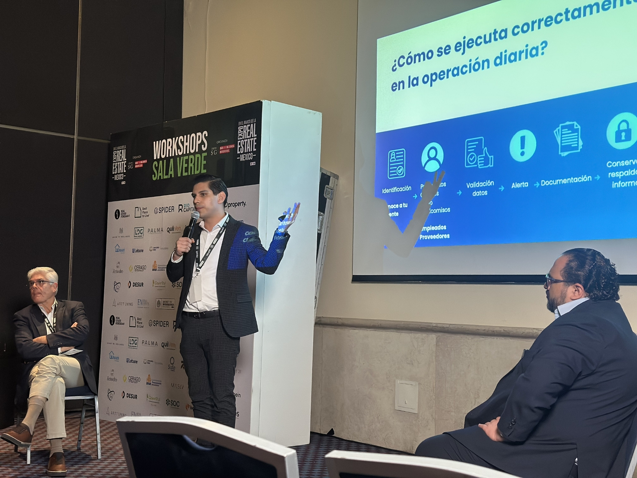 Además, tuvimos la oportunidad de participar en el workshop “Prevención de Lavado de Dinero: El Nuevo Estándar para Operar en el Sector Inmobiliario”, impartido por Ángel Córdova, un espacio que permitió aterrizar el tema a una visión práctica para la industria y reforzar la importancia de operar con criterios claros, documentación adecuada y una gestión preventiva del riesgo.
